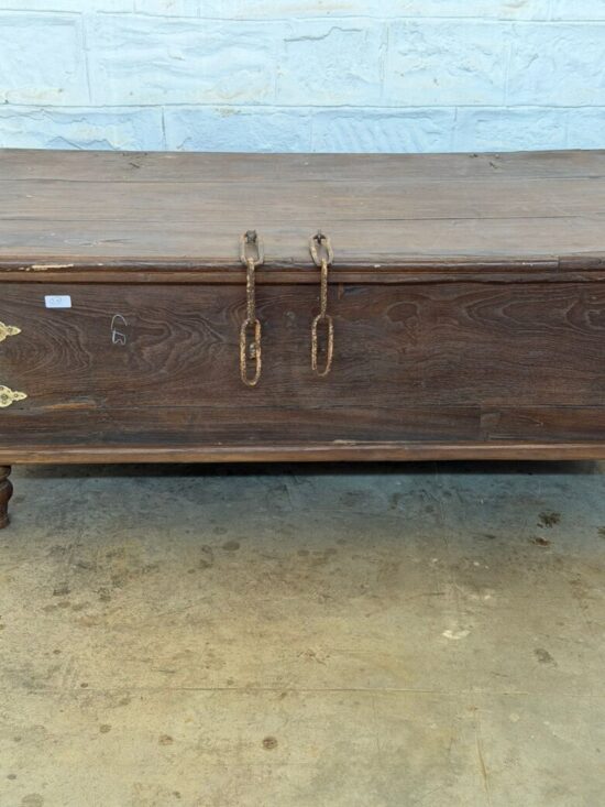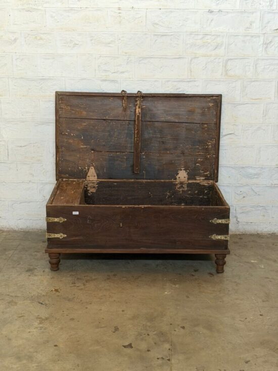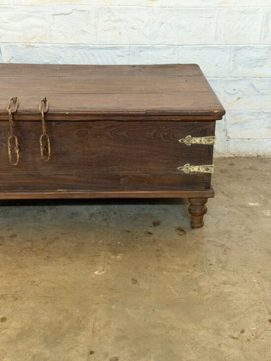 This exceptional vintage Indian wooden trunk is an authentic antique storage chest, originally handcrafted for household use and long-term storage. Built from solid old wood with traditional joinery and reinforced panel construction, it now serves beautifully as a rustic coffee table, blanket box, or statement storage chest.