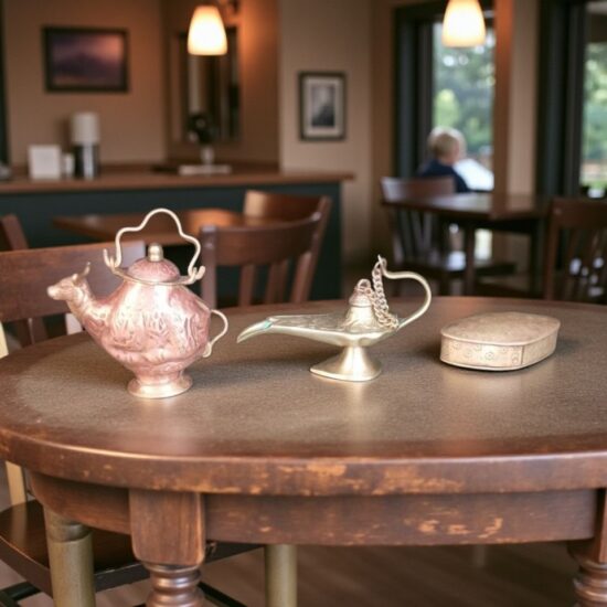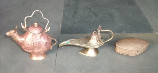 The cow-shaped vessel was traditionally used to hold holy water, milk, or offerings in temples and household shrines. The oil lamp reflects classic Indian ceremonial design, while the engraved box was used to store sacred items, kumkum, or small valuables. Together, the three pieces form a cohesive and highly collectible ritual set.