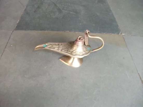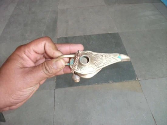 This rare set of three vintage Indian ritual objects includes a beautifully engraved cow / ox (Nandi) shaped pot, a traditional oil lamp, and a matching engraved brass box. Crafted in solid brass and copper, each piece dates back approximately 60–70 years and displays a deep, naturally developed patina.