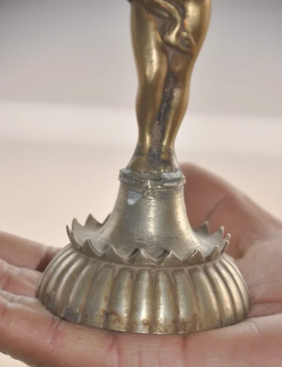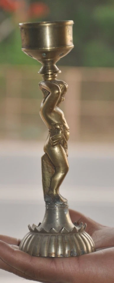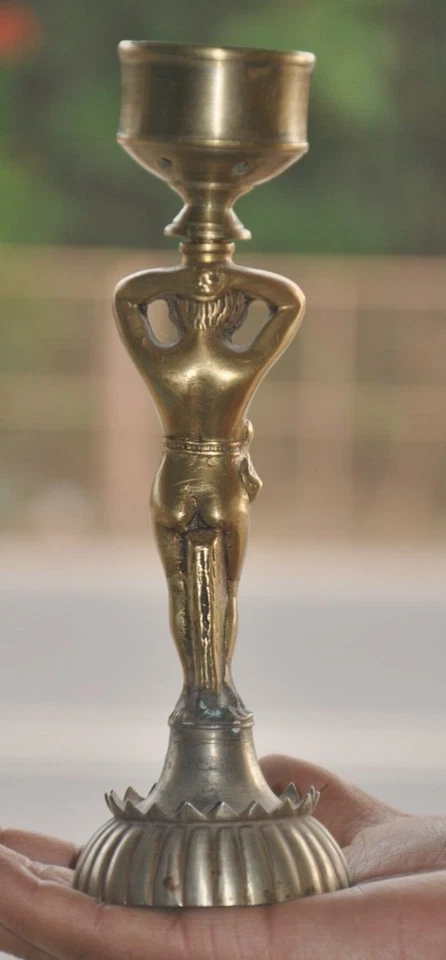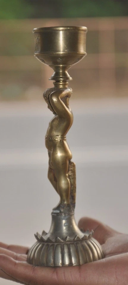 Handcrafted with fine detailing, the figurine depicts a poised female form holding a candle cup above her head, creating a striking silhouette. The natural aged patina enhances its vintage appeal, giving it depth, warmth, and authenticity.