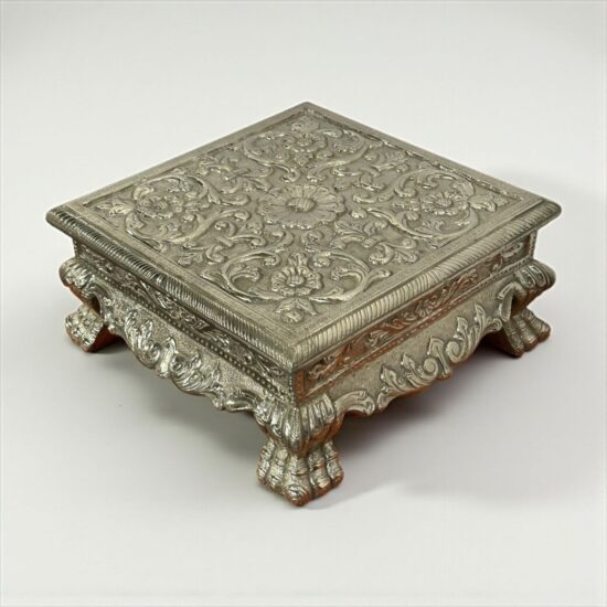 Handcrafted from solid wood and beautifully overlaid with German silver (white metal), the chowki features intricate floral and vine carvings that reflect India’s rich artisanal heritage. Its sturdy design and antique charm make it a perfect addition to modern and traditional homes alike.