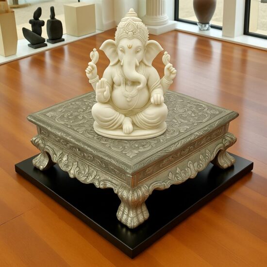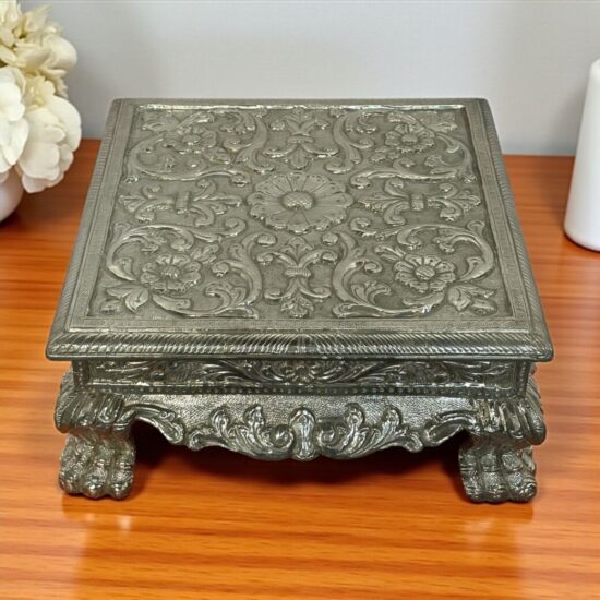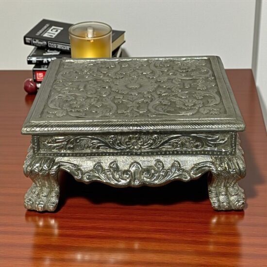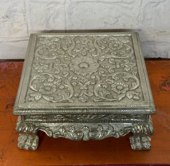 Bring timeless elegance and Indian craftsmanship into your home with this German Silver Chowki (Bajot). Traditionally used in Indian households for worship rituals, seating, or as a display stand, this versatile piece is both functional and decorative.