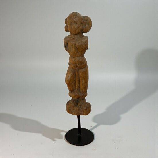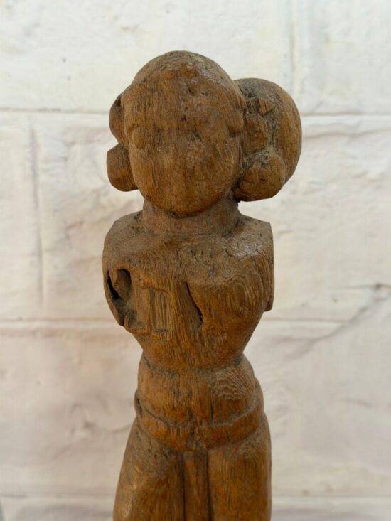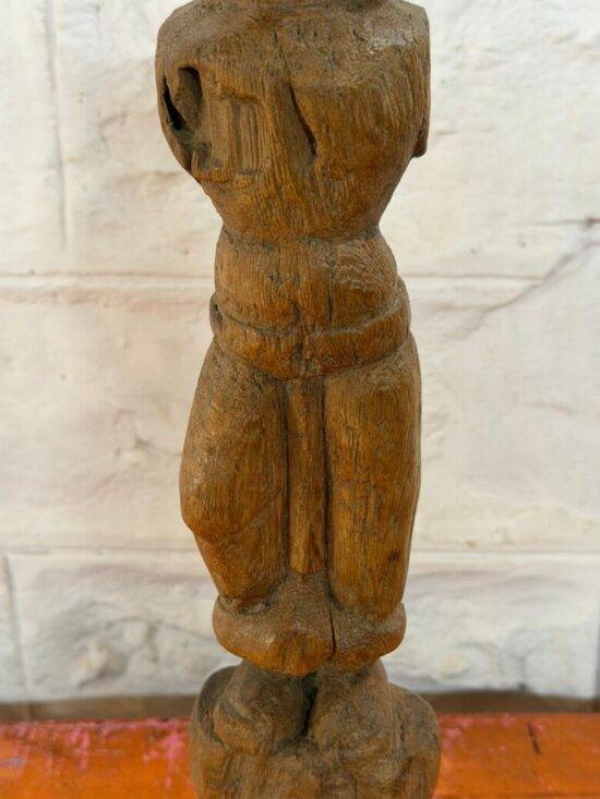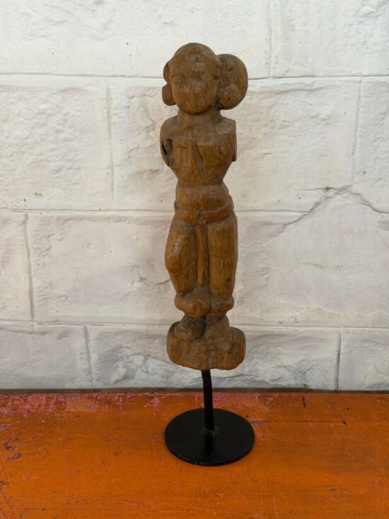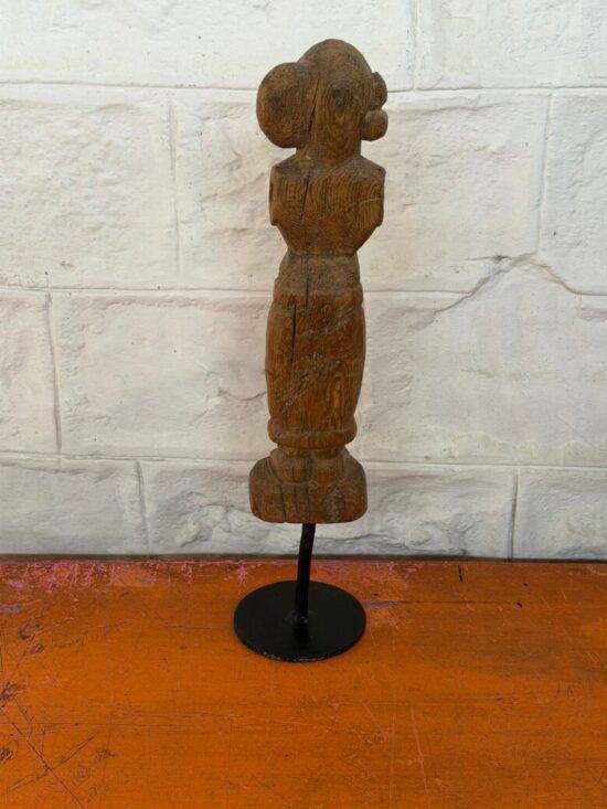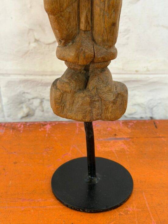 Add a touch of rustic charm and historical character to your space with this beautifully hand-carved wooden figurine. Standing on a sleek black metal base, this unique piece features a stylized figure dressed in traditional attire, showcasing intricate craftsmanship and aged patina. Its vintage appeal and folk-art origins make it a perfect statement piece for shelves, mantels, or curated collections. Ideal for collectors of ethnic art, wood carvings, or eclectic home decor.
