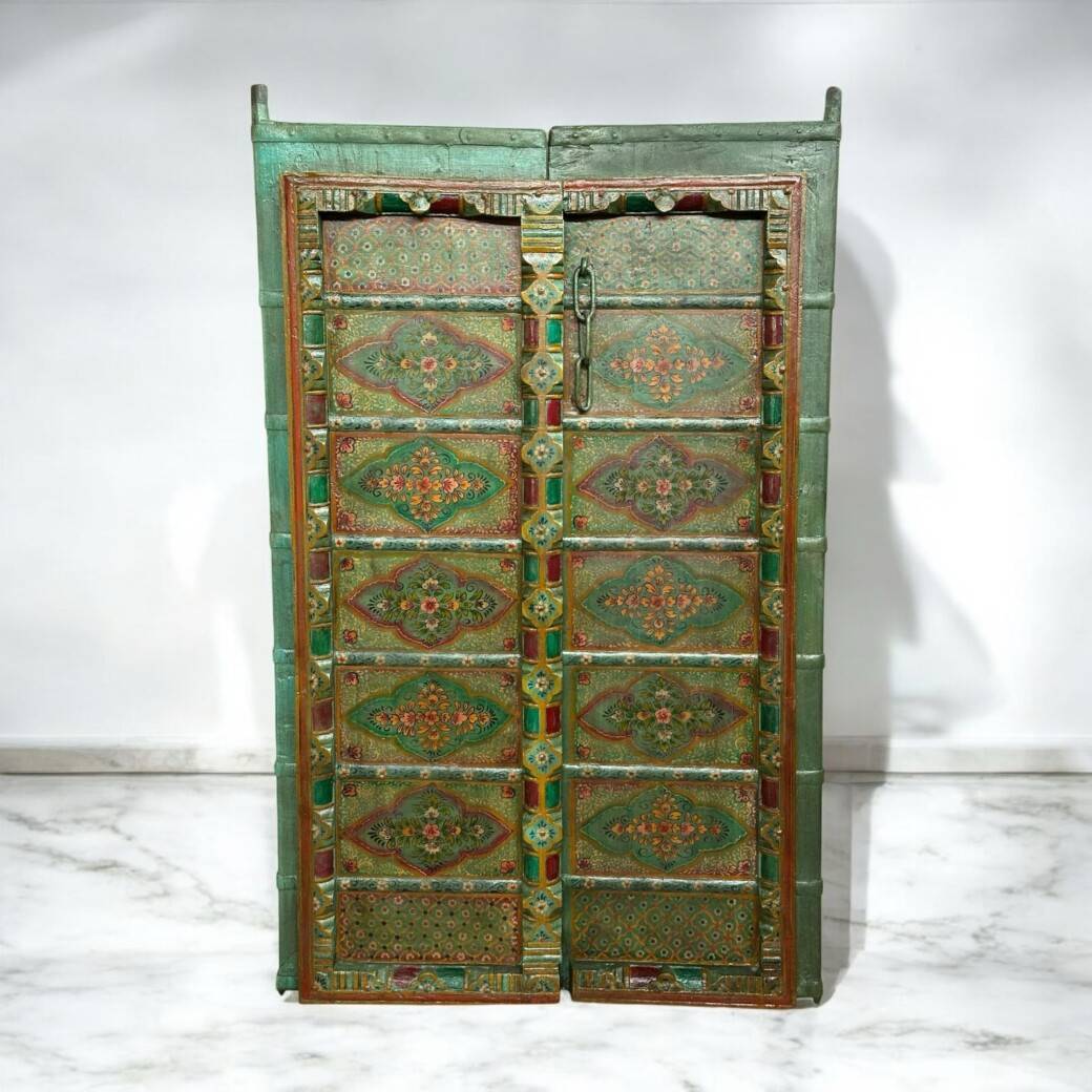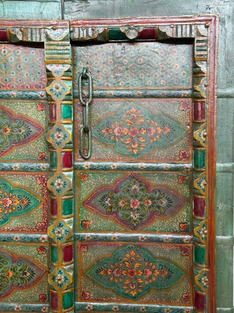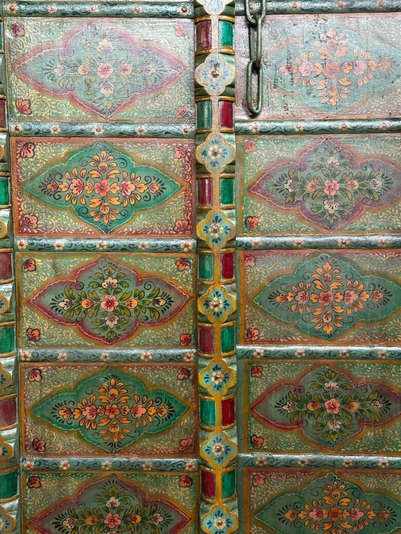 Each panel of this door is adorned with intricate hand-painted floral motifs in warm shades of green, yellow, and red, creating a vibrant tapestry of traditional design. The symmetry of the artwork, combined with the aged patina of the wood, gives it a distinct character that only decades of history can impart. The central panels feature delicate flower clusters framed within diamond and oval shapes, symbolizing growth, beauty, and prosperity.