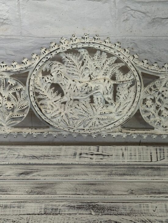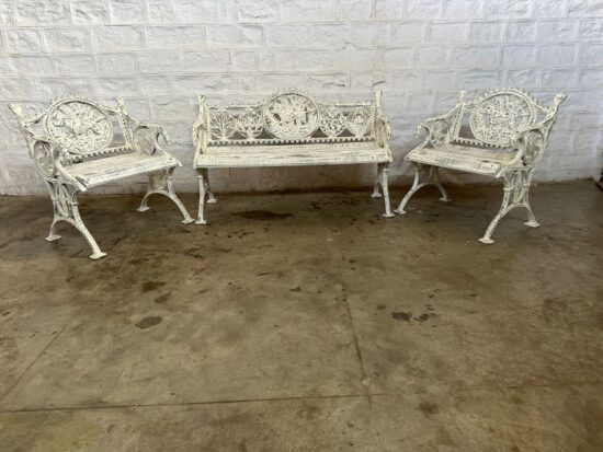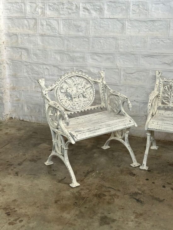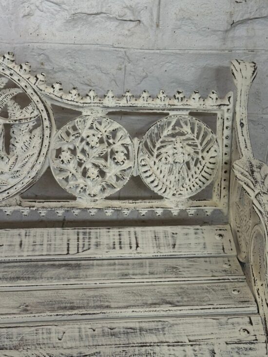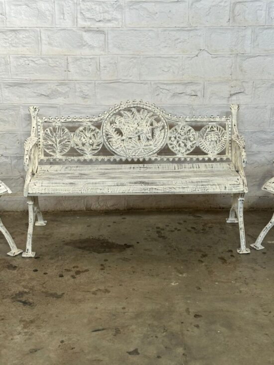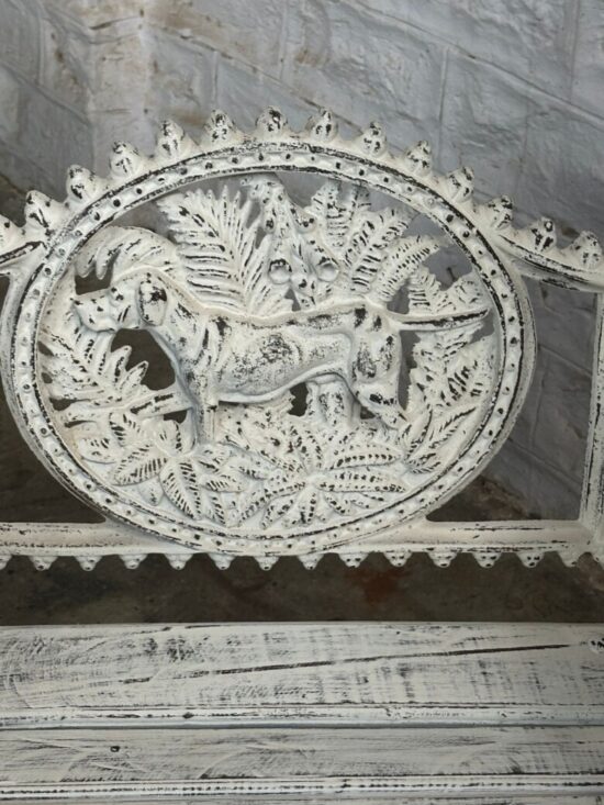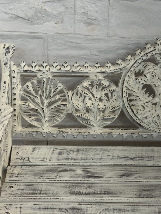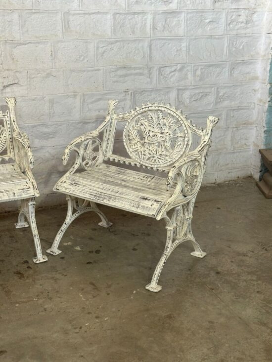 The weathered white patina adds a romantic, shabby-chic appeal, making it perfect for vintage-inspired outdoor living spaces, conservatories, or boutique cafés. The heavy cast iron construction ensures durability, while the carved detailing brings elegance and old-world craftsmanship to your seating area.