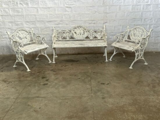 Bring timeless charm to your garden, patio, or veranda with this vintage teak and cast iron patio sofa set. The set includes one ornate bench and two matching chairs, each featuring intricately cast iron frames paired with sturdy teak wood seating.
