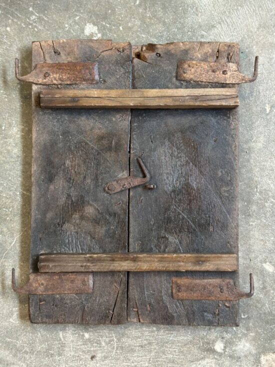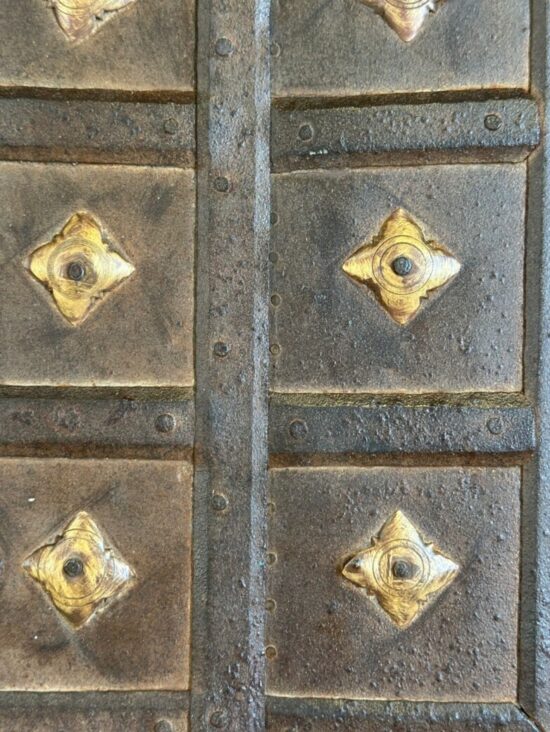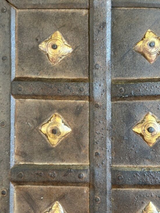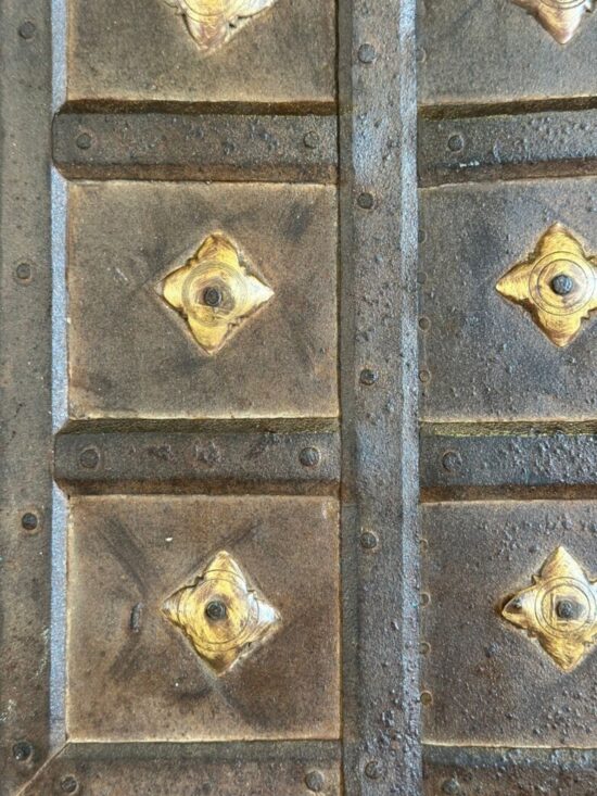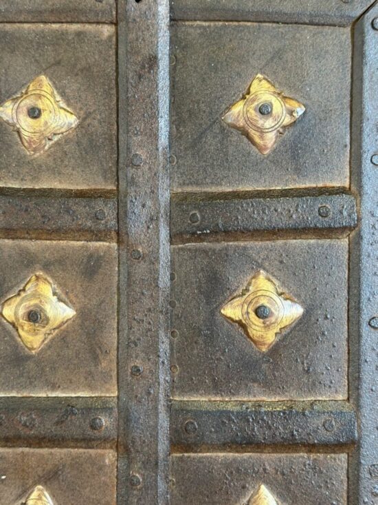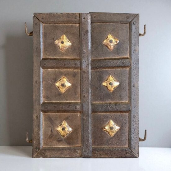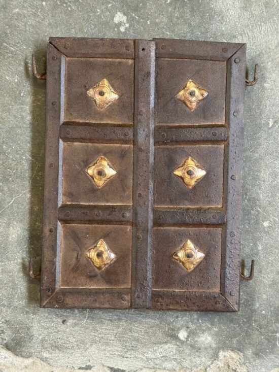 The panel features brass studded motifs against a dark wooden base, showcasing the rich tradition of Indian craftsmanship. Such small windows were often used in temples, shrines, or havelis for ventilation, decoration, and spiritual protection. Its heavy patina and wear mark its authenticity and long history.