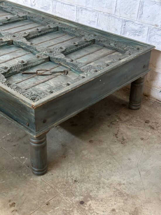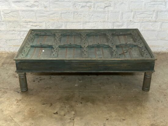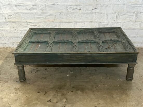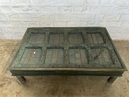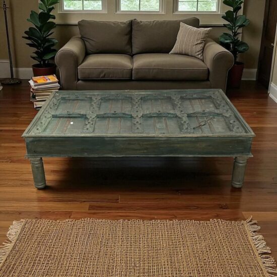 Add a touch of heritage and rustic elegance to your home with this Vintage Indian Door Coffee Table. Handcrafted from solid wood, this unique piece is repurposed from an antique Indian door, showcasing iron accents, rivets, and a distressed patina that reflects decades of character and craftsmanship.