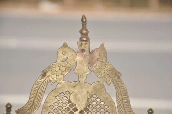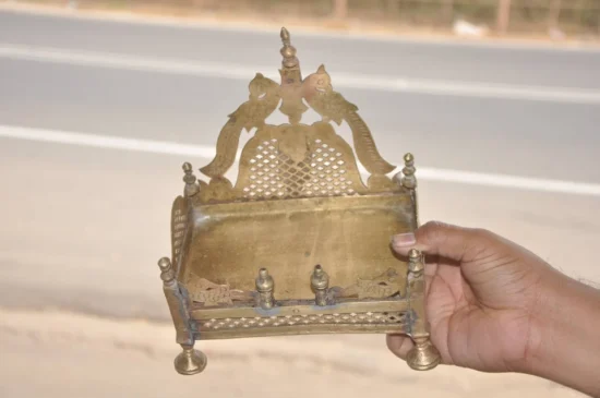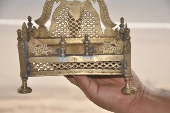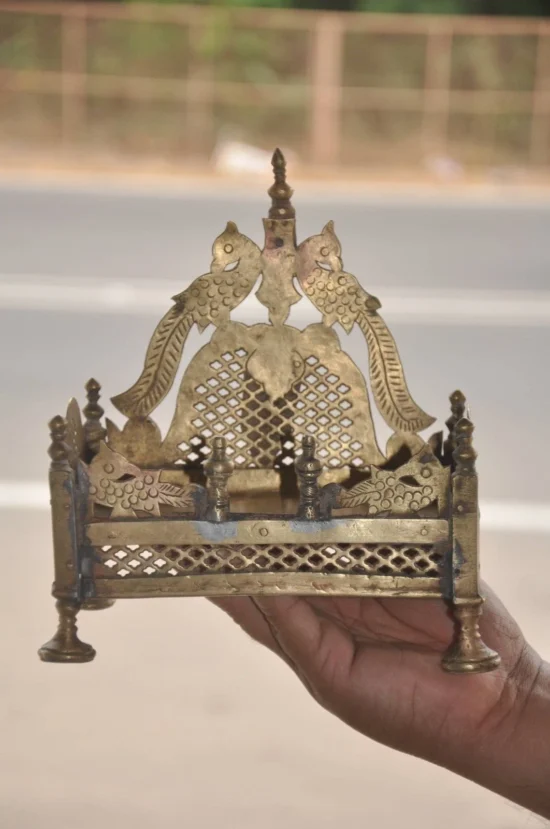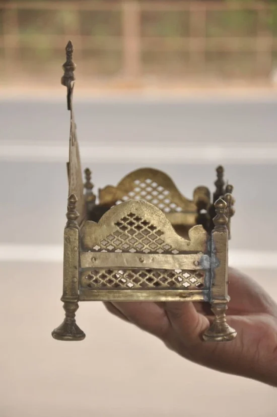 Bring home a rare and authentic piece of Indian heritage with this Vintage Brass Handcrafted Temple/Shrine, dating back 60-70 years. This compact temple is a timeless collectible, crafted from solid heavy brass and adorned with intricate jali cut work that reflects traditional Indian craftsmanship.