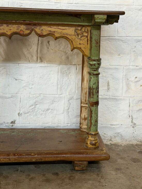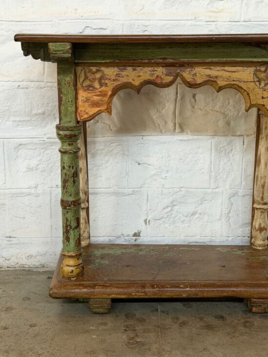 This authentic 19th-century Indian wooden temple is a remarkable example of traditional craftsmanship and architectural detailing. Hand-carved from solid wood, it features beautifully detailed arches, spindle columns, floral motifs, and an aged natural patina developed over more than a century.