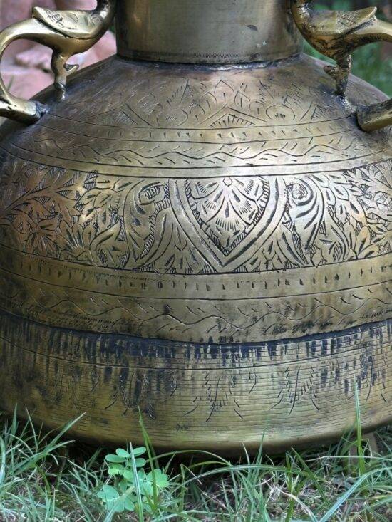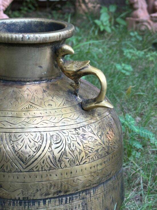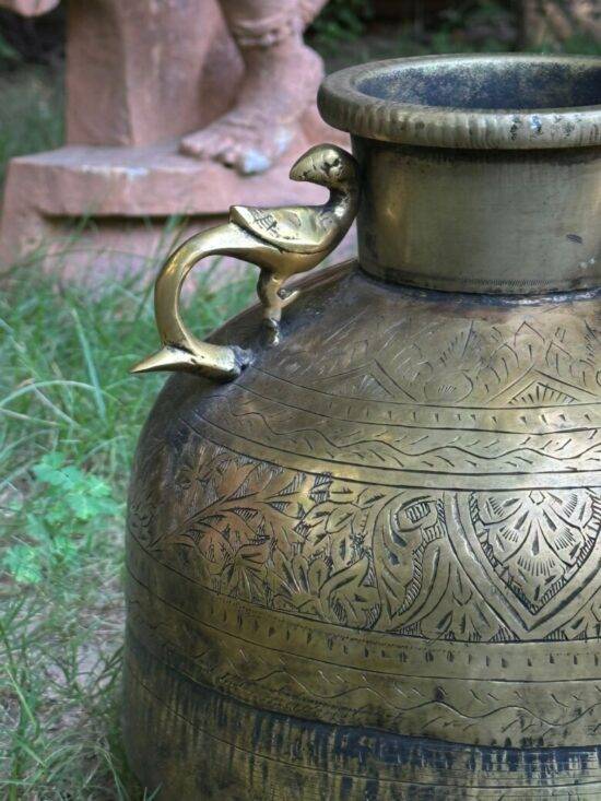 Its rich patina and solid brass weight (3.2 kg) reflect its age and authenticity, making it a perfect heritage piece for your home. The fine detailing on the body and unique handles highlight the mastery of Indian artisans.