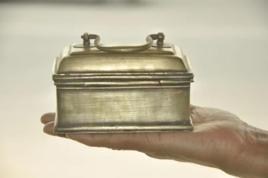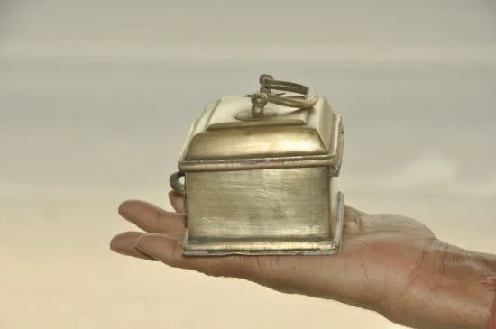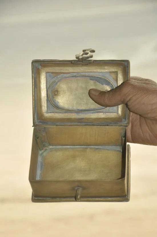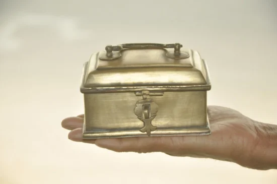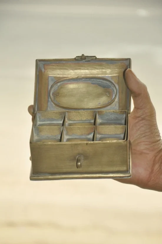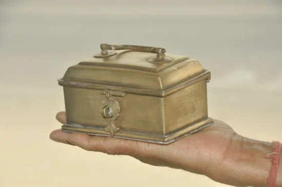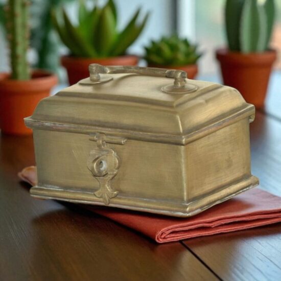 Its compact yet intricate design makes it perfect for storing small items such as jewelry, spices, or keepsakes, while also serving as a decorative collectible with heritage value. The rich patina adds to its antique charm, making it a stunning piece for collectors of vintage brassware and cultural artifacts.
