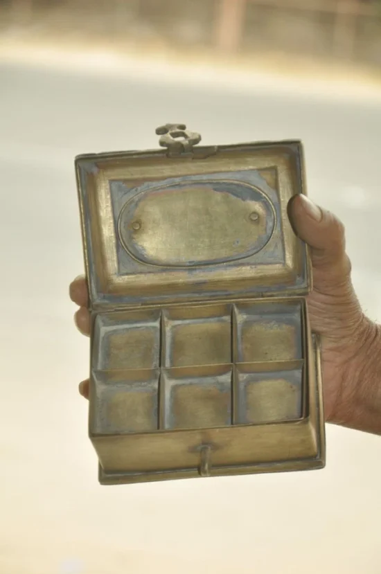 This vintage handcrafted solid brass betel nut box is a beautiful example of traditional Indian metalwork, dating back approximately 60–70 years. Designed with six compartments, it was traditionally used to store betel nuts (supari), an important part of South Asian cultural hospitality and rituals.
