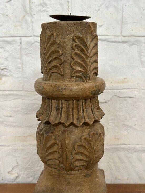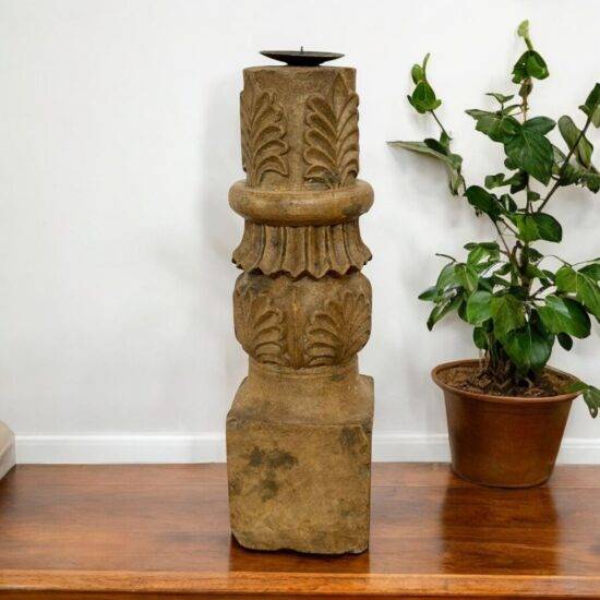 The carved botanical motifs and tiered base speak of classical Indian design elements, while its sturdy, weighty form makes it both sculptural and functional. Use it as a candle stand, plant riser, or a solo decor piece in entryways, living rooms, or verandas.