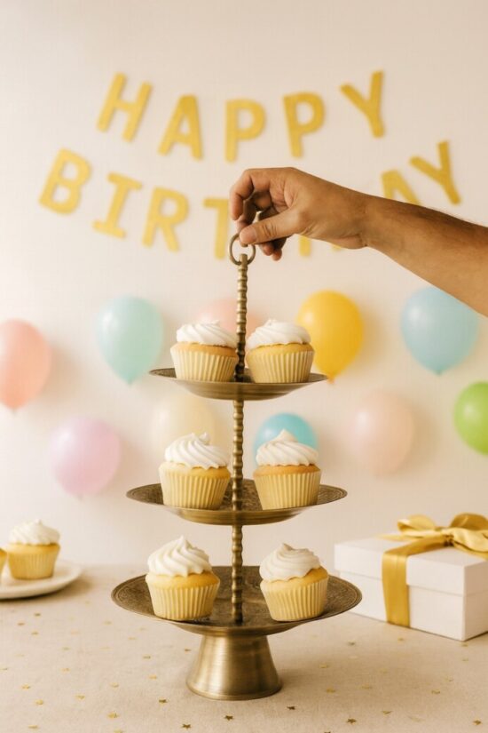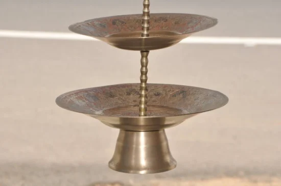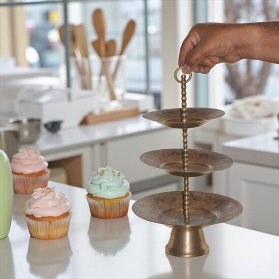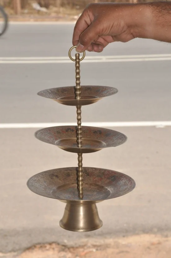 The stand has three compartments, ideal for serving cupcakes, pastries, sweets, or even dry fruits during gatherings. A sturdy brass handle allows for easy carrying, making it as practical as it is decorative.