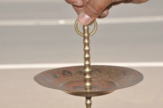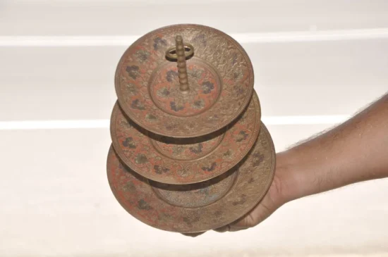 This Vintage Brass 3-Tier Cupcake Stand is a timeless collectible, perfect for both functional use and display. Crafted 60–70 years ago, it features intricate lacquer work across all three tiers, adding a touch of elegance to its traditional design.