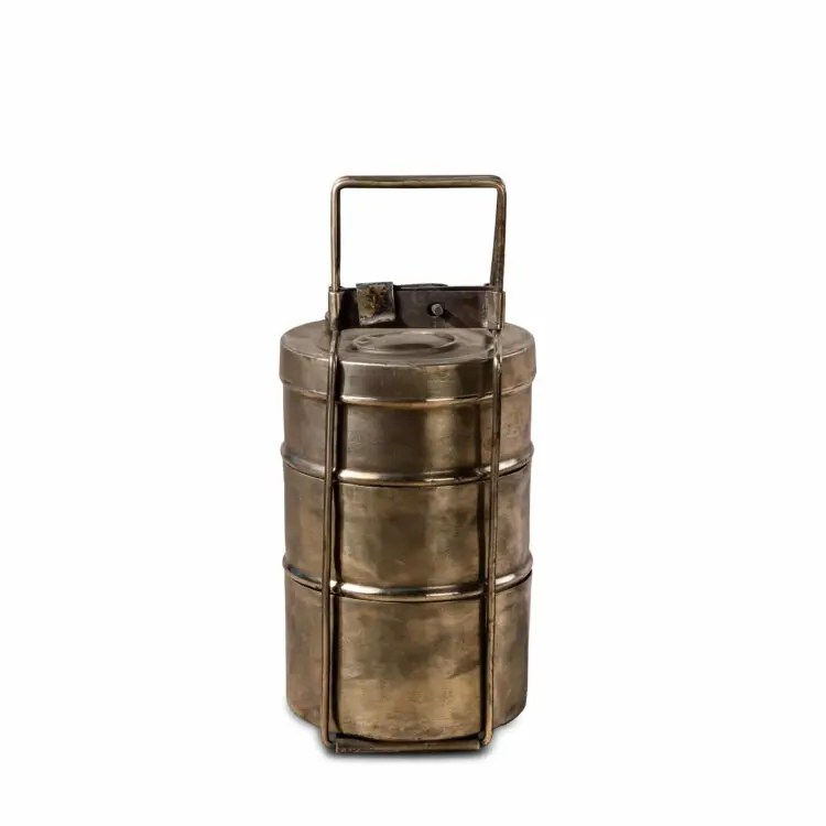 This vintage brass 3 tier tiffin box has three compartments- one for Indian bread/rice and the other for vegetables.