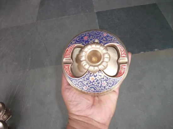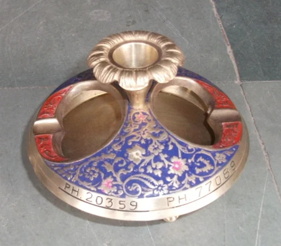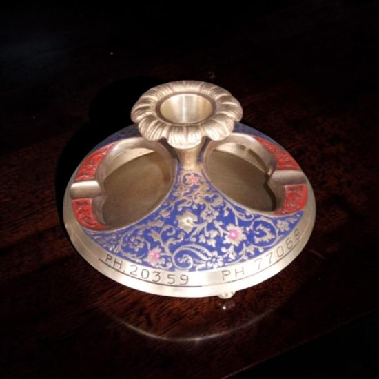 Featuring intricate lacquer engraving and a beautifully aged patina, this piece reflects the craftsmanship of a bygone era. The thoughtful design combines an ashtray with a central candle holder, making it both practical and visually striking.