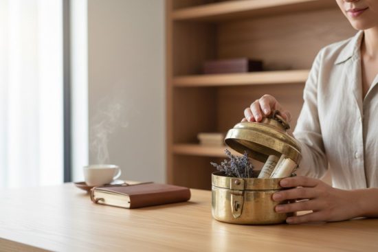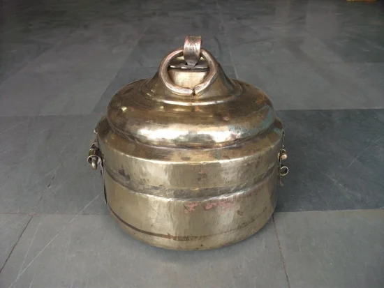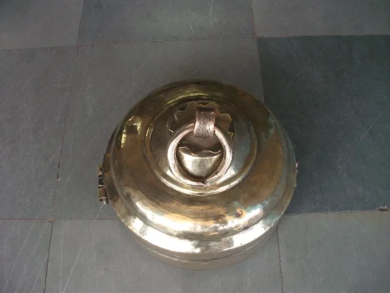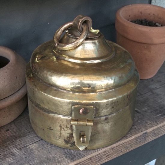 This piece reflects traditional Indian metal craftsmanship, with its solid brass build, soft aged patina, and utilitarian yet elegant design. Originally used for storing valuables, it now makes a striking decor + storage piece.