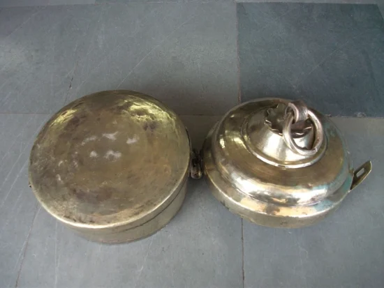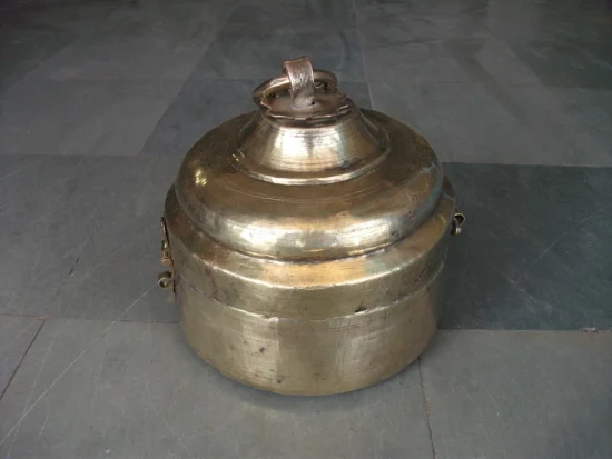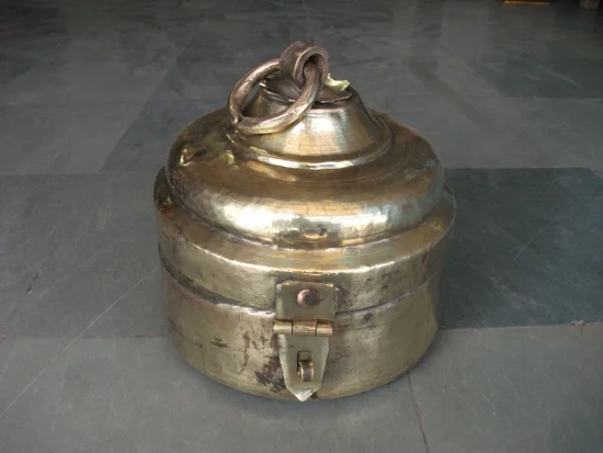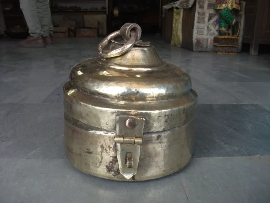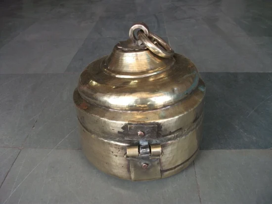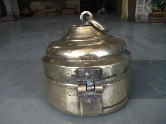 A beautiful vintage handcrafted brass jewelry box, dating back approximately 60–70 years, featuring a rare rounded form with a sturdy top ring handle and secure latch closure.