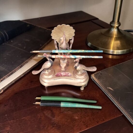 The sculptural peacock design forms the centerpiece, flanked by decorative birds and integrated pen rests. It includes four wooden pen holders and inkwell spaces, making it both functional and highly collectible.