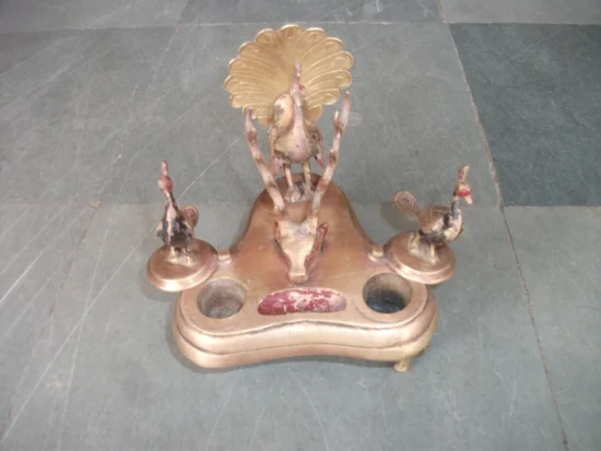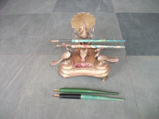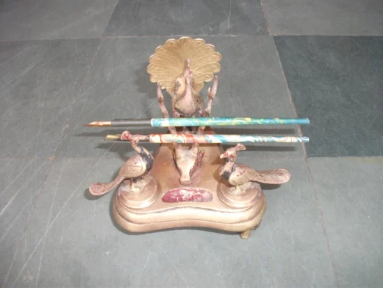 Vintage Brass Peacock Pen and Inkpot:
