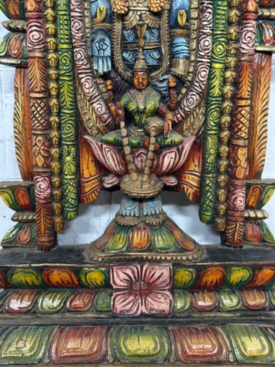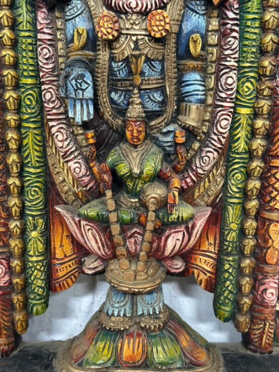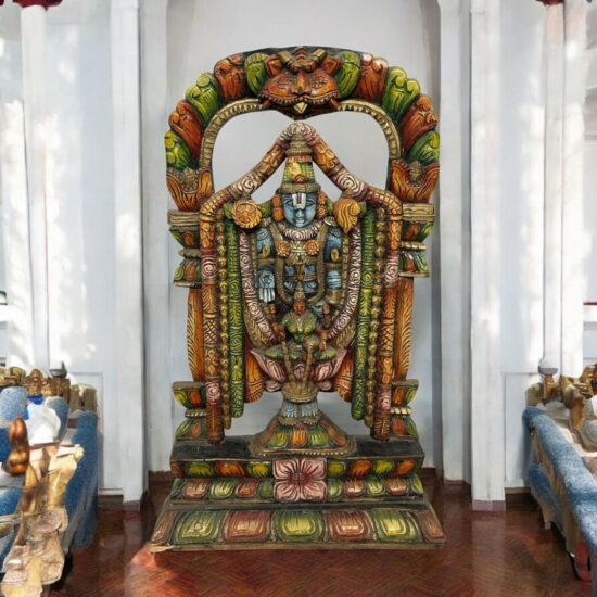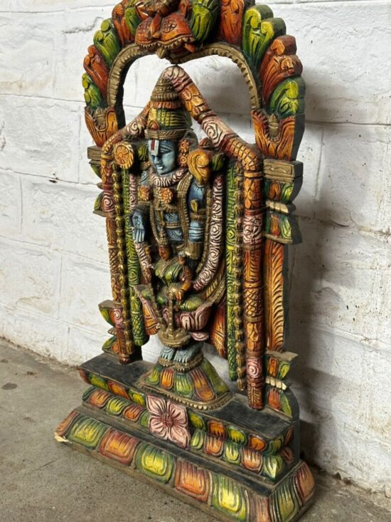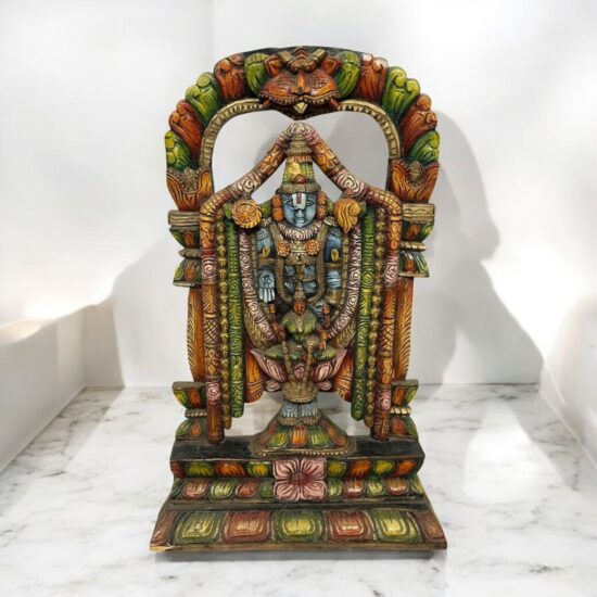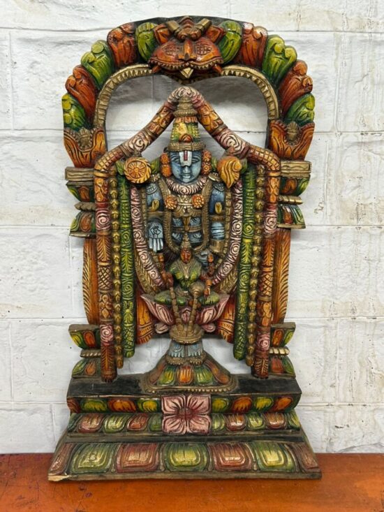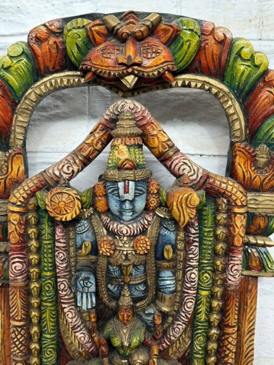 This beautifully hand-carved and hand-painted wooden panel depicts Lord Venkateshwara (Lord Balaji), a revered deity in Hindu tradition. Crafted in traditional South Indian temple style, this piece is made from solid wood and features intricate details throughout the arch, base, and deity figure.