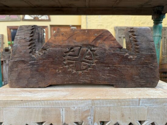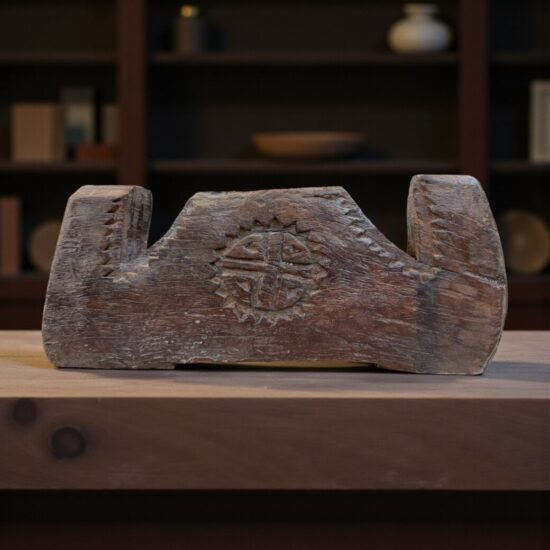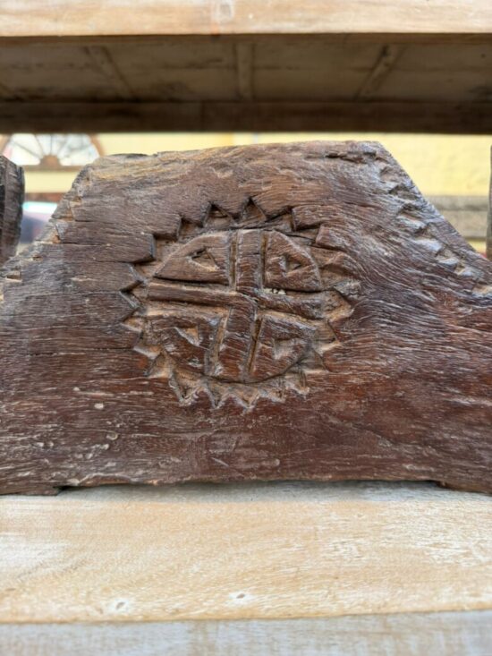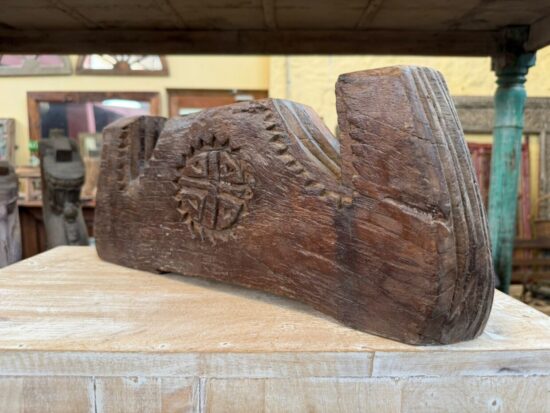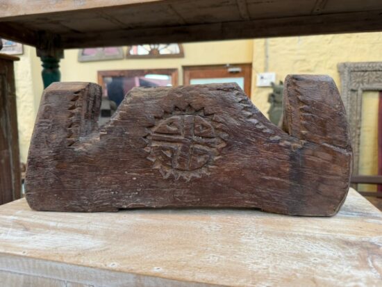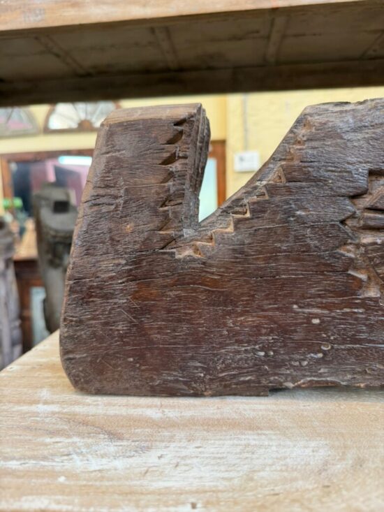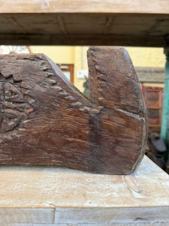 Originally part of an old wooden saddle, this piece now stands as a decorative accent or collectible artifact, embodying the rustic beauty of vintage Indian woodwork. Its simple yet striking geometric carvings make it ideal for display on console tables, shelves, or as part of a curated gallery collection.