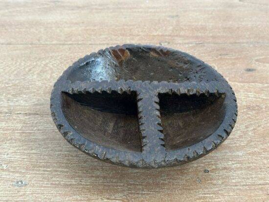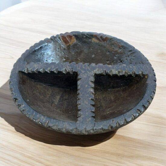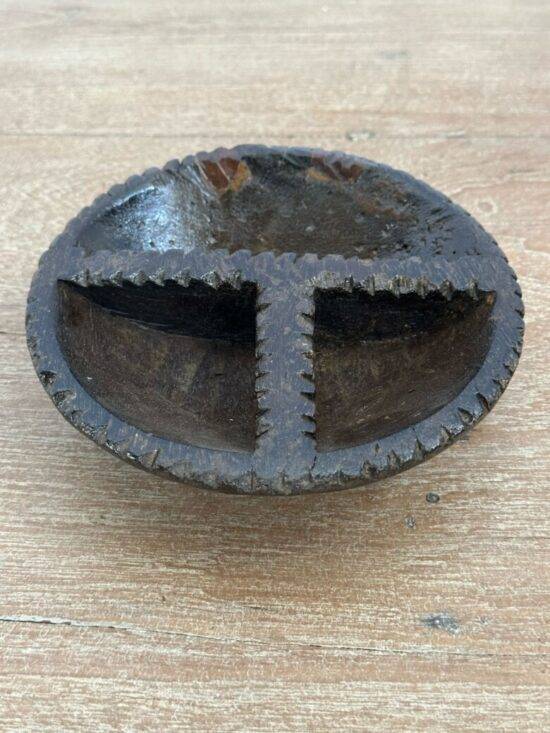 Add a touch of rustic charm and cultural authenticity to your home with this exquisite hand-carved wooden tribal bowl. Crafted from solid wood and rich in character, this unique piece features three distinct compartments separated by intricately carved, jagged-edged ridges — a true testament to artisanal craftsmanship.