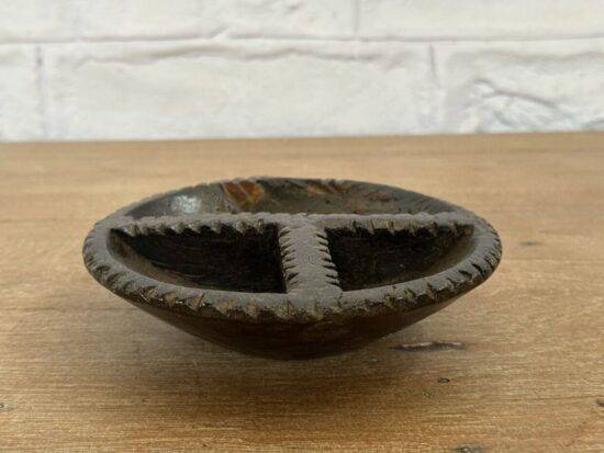 Design: Circular form with 3 segmented compartments, separated by hand-carved zigzag ridges