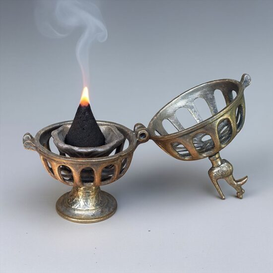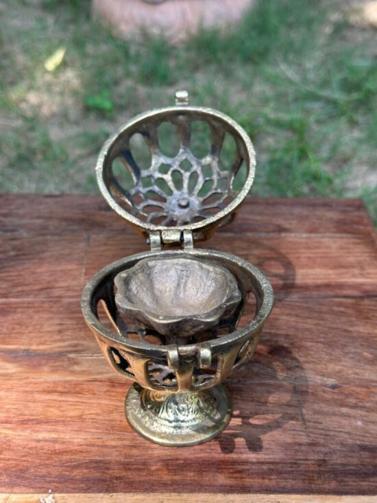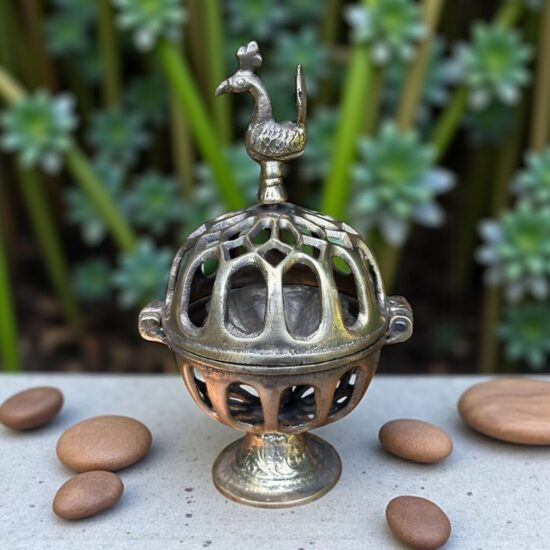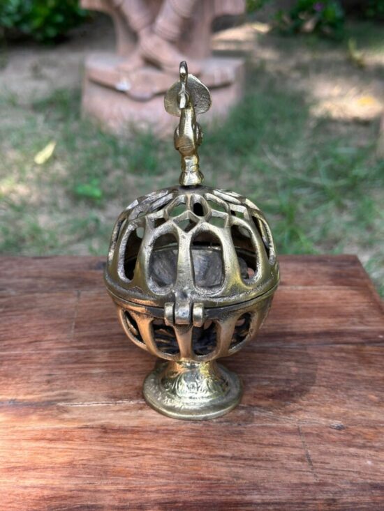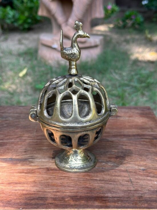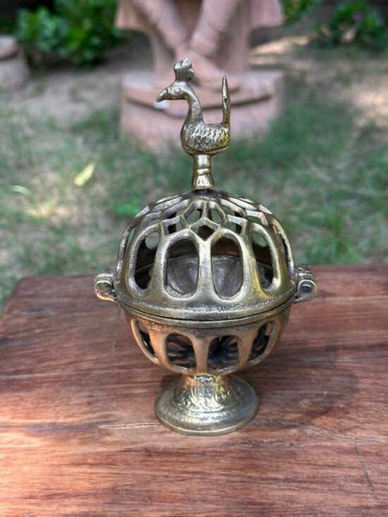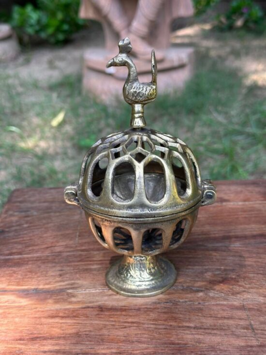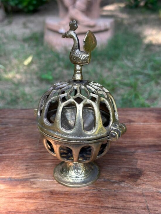 Handcrafted in solid brass, it features a beautiful dome design with a peacock finial on top and intricate cutwork that allows fragrant smoke to diffuse gracefully. Its rich aged patina tells the story of its journey through time, making it not just a functional incense holder but also a collectible decor piece.