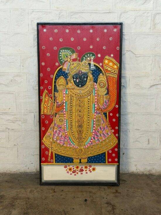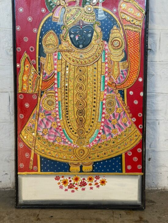 Vintage Indian Hand Painted Shrinathji Wall Panel – Large 25 x 49 Inch Traditional Temple Art