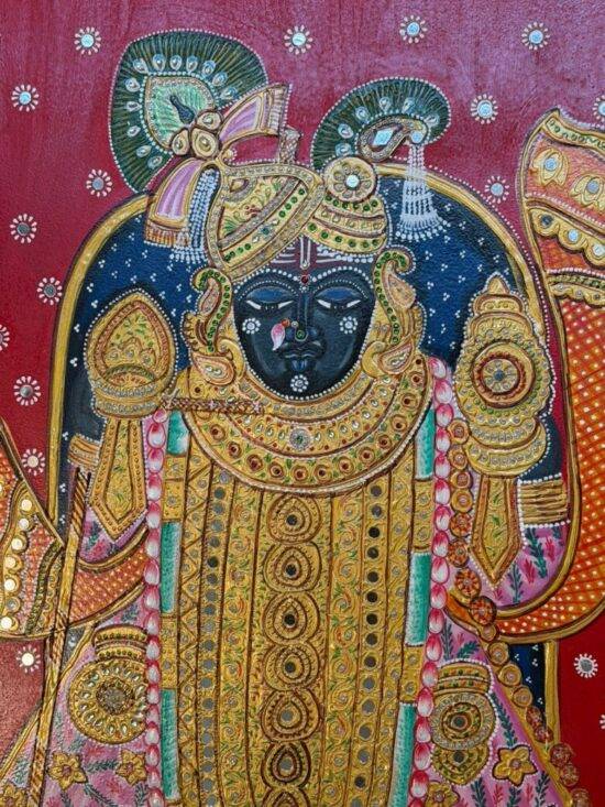 The artist’s meticulous detailing—intricate patterns, raised textures, ornate jewelry, delicate facial expression, and layered embellishment—reflects the devotional purpose behind Pichwai-style artwork. The deep red and navy backgrounds, dotted with symbolic star motifs, frame the deity in a ceremonial aura of festivity and reverence.