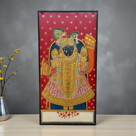 This is an exceptional vintage hand painted wall panel of Shrinathji, created in the traditional Pichwai-inspired style that originates from Nathdwara, Rajasthan. Painted on a large vertical wooden panel, this piece captures the divine form of Shrinathji, adorned in elaborate jewels, rich textiles, and ceremonial motifs associated with Vaishnav and Pushtimarg traditions.