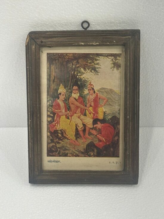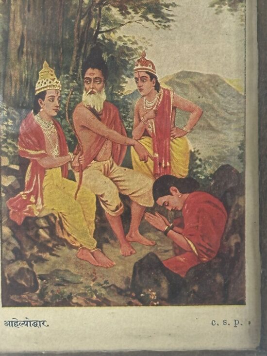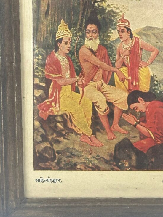 Journey into the mythic moment of Ahalya’s liberation with this compelling vintage lithograph—”Ahalyodhar”—an intimate portrayal from the Ramayana.