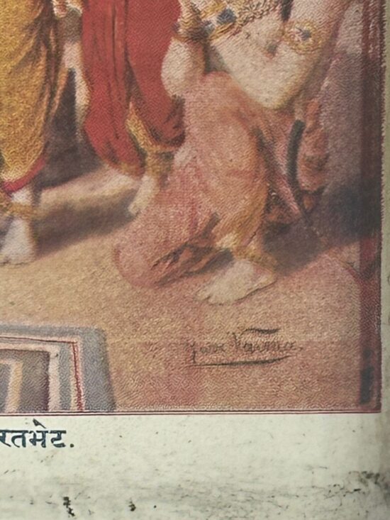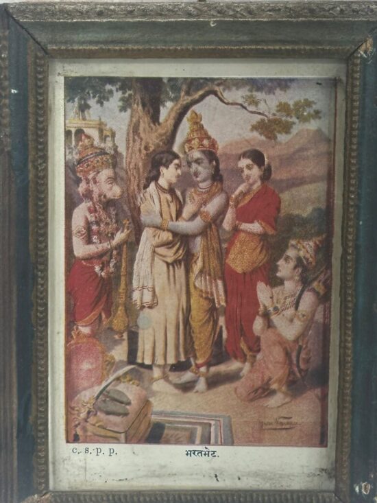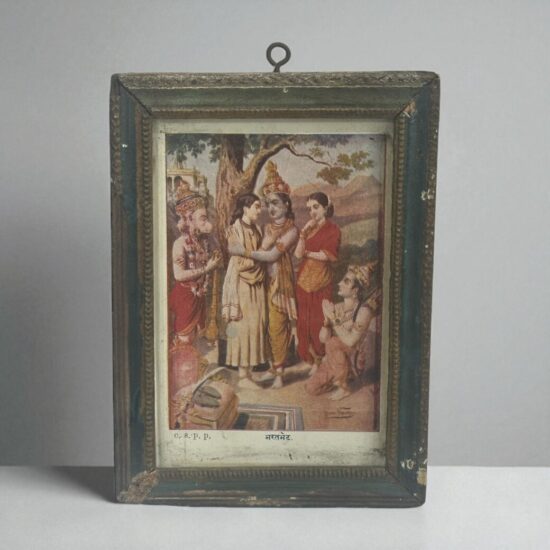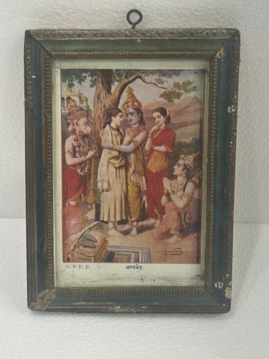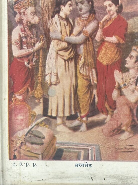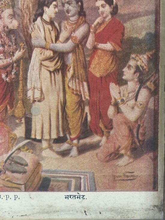 Bring home a treasured moment from the Ramayana with this vintage lithograph “Bharat Bhet”, depicting the touching reunion of Bharata with Lord Rama during his exile. This iconic scene, rendered in the beloved style of Raja Ravi Varma, was printed as an early 20th-century Ravi Varma Press lithograph.