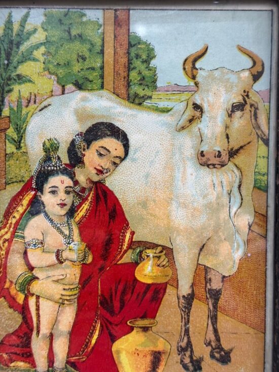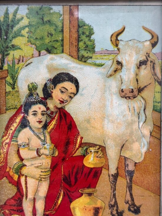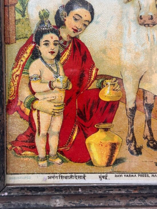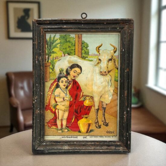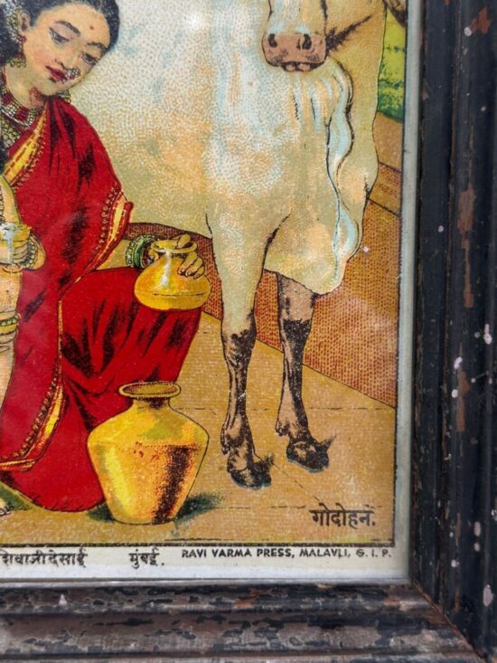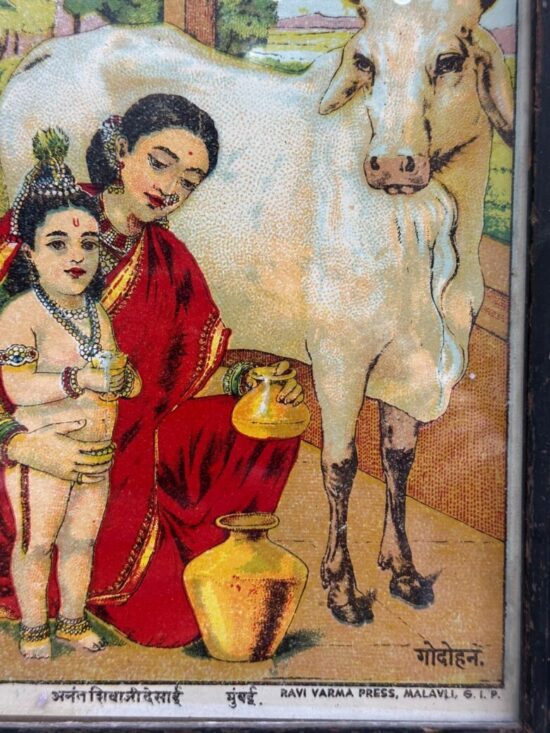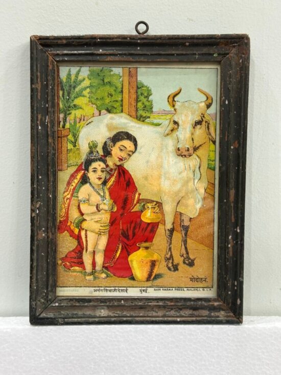 This is a vintage oleograph titled “Godohan”, originally painted by Raja Ravi Varma (1848–1906) and produced by the Ravi Varma Press, Malavli. Measuring 6.5 x 9 inches, this devotional print captures the timeless relationship between Krishna, his mother Yashoda, and the sacred cow.