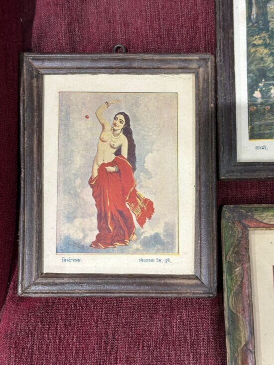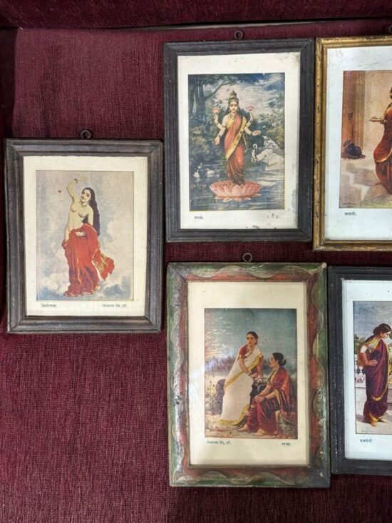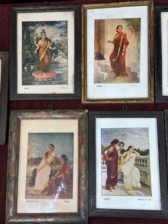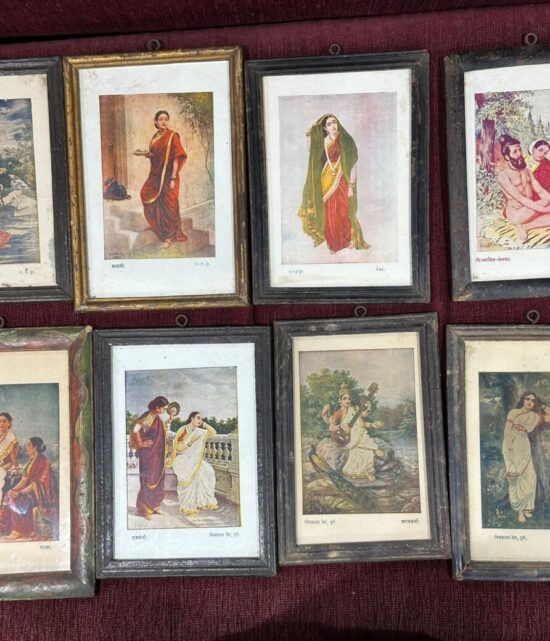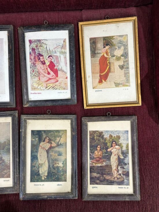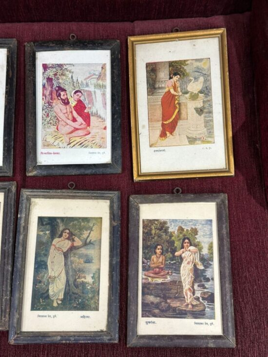 This is a rare vintage collection of 11 framed lithographs (oleographs) after paintings by Raja Ravi Varma (1848–1906), one of India’s greatest and most influential artists. Each print measures approx. 6 x 8 inches and is framed in original vintage wooden frames.