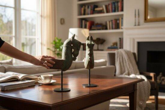 Mounted on minimalist black metal stands, they make a bold statement for consoles, sideboards, bookshelves, offices, or curated gallery décor. The patina highlights their age and authenticity, adding texture and character to any interior style—modern, bohemian, rustic, or eclectic.
