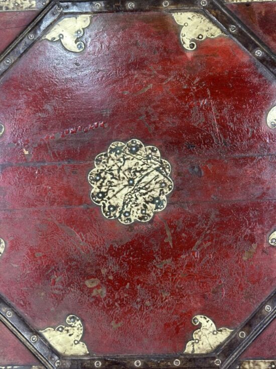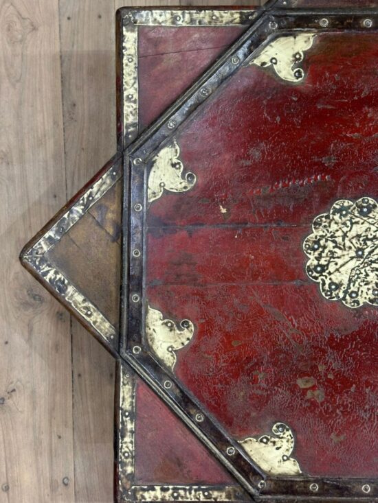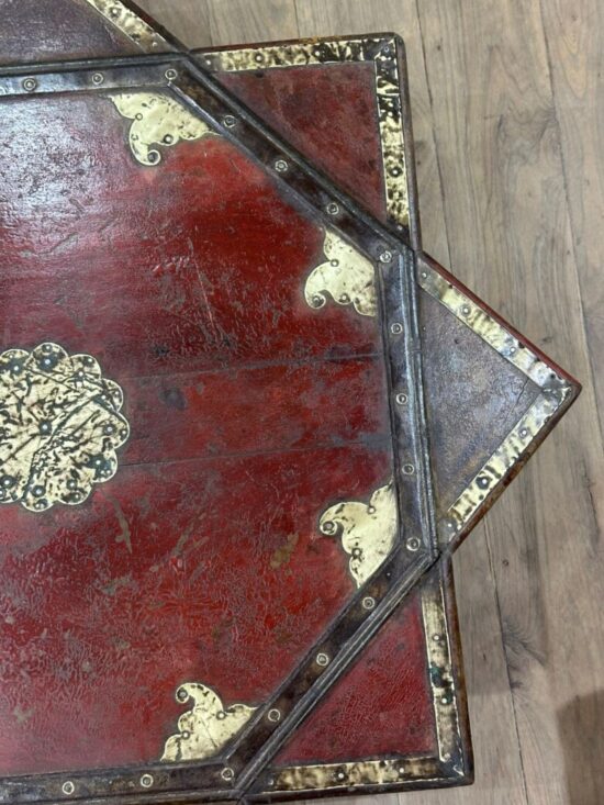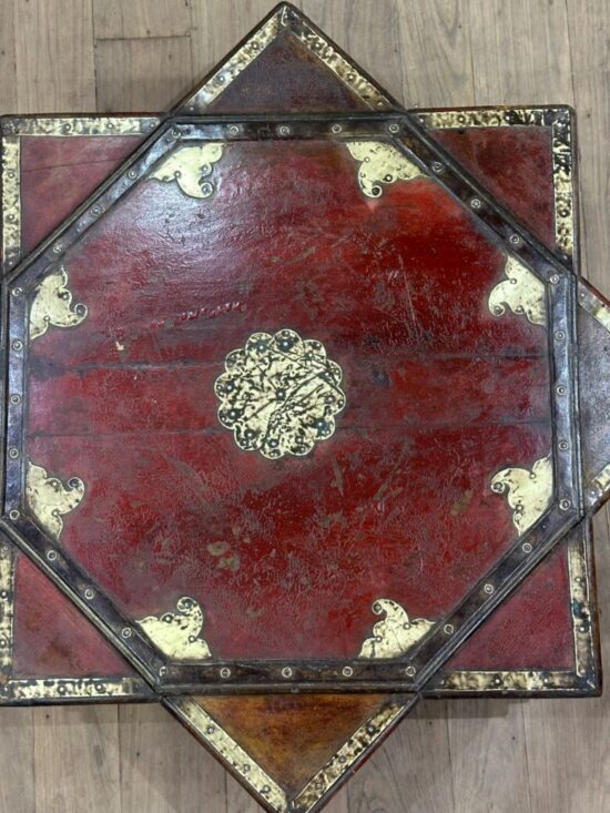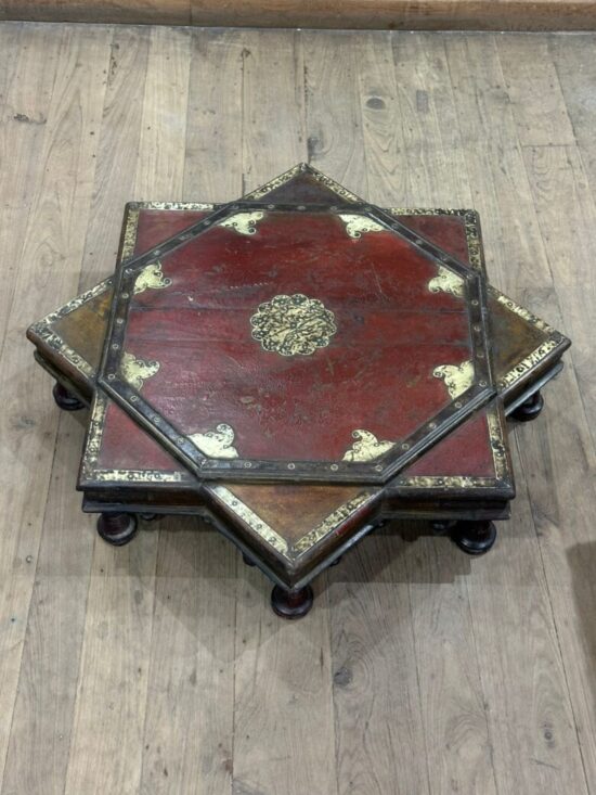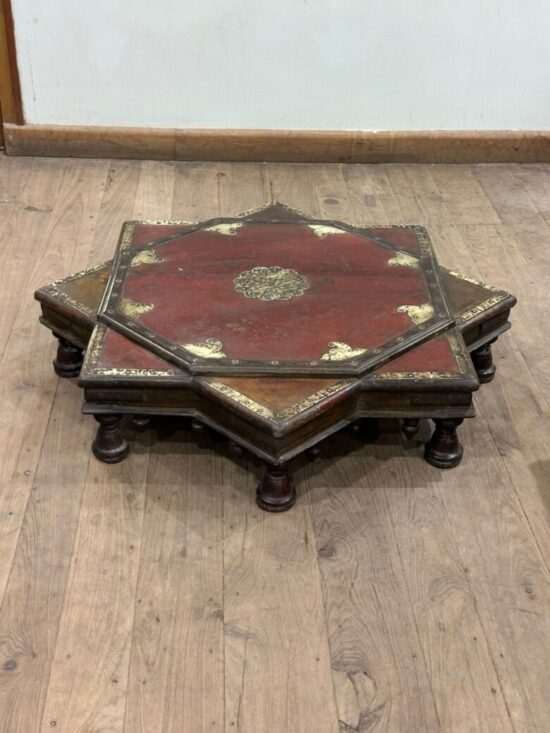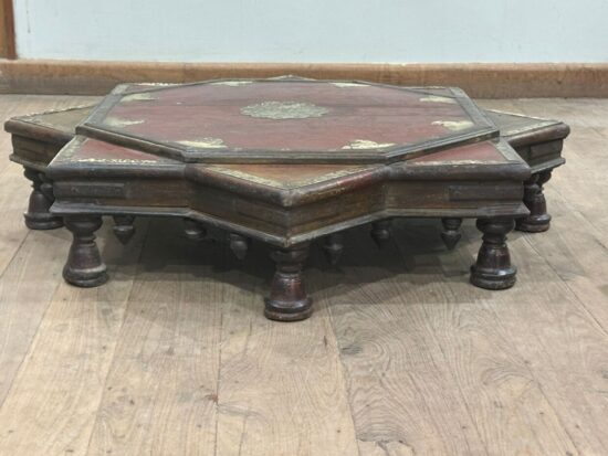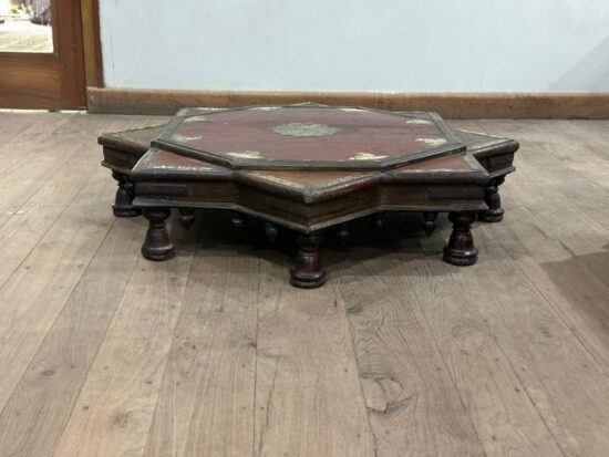 A truly rare antique — this star-shaped Indian chowki is over 100 years old and hand-carved from solid teak wood with intricate brass inlay work. Traditionally used as a family meal platform, each corner of the star would seat a family member, gathered around a single thali placed at the center. It embodies both utility and heritage.