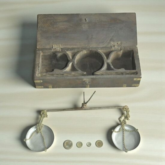 Originally used by jewelers to weigh gold, silver, and other precious metals, this antique balance scale comes in its original wooden box, complete with four brass weights and beautifully aged components. The handcrafted detailing and natural patina on both wood and brass make it a charming collectible for vintage lovers and decor enthusiasts alike.