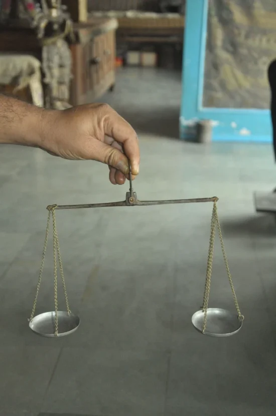 Vintage wooden boxed brass balance scale with 4 weights, 70 years old. Used to measure gold & silver — a perfect collectible for vintage enthusiasts.