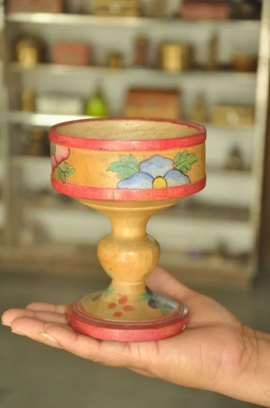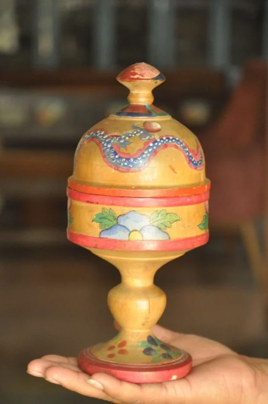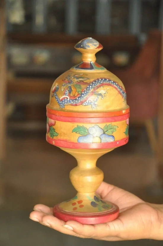 This is an authentic 60–70 year old vintage wooden kumkum box, beautifully crafted in a rare pedestal form and finished with traditional handpainted lacquer artwork. The most striking feature is the dragon motif painted across the domed lid—an unusual and collectible element in Indian folk lacquerware.