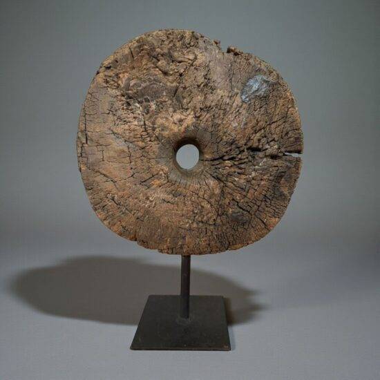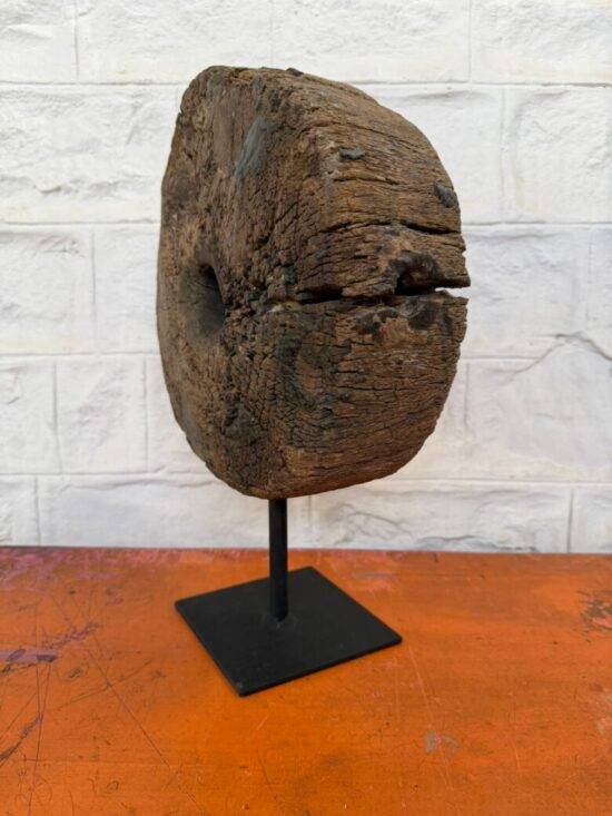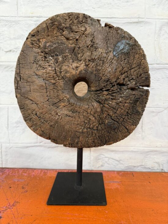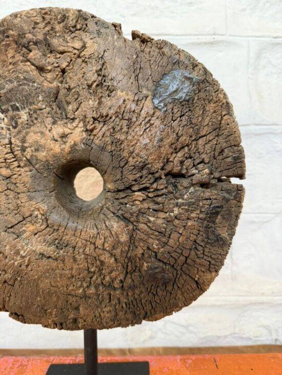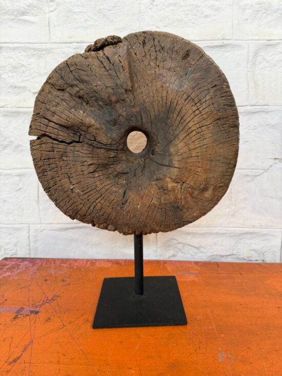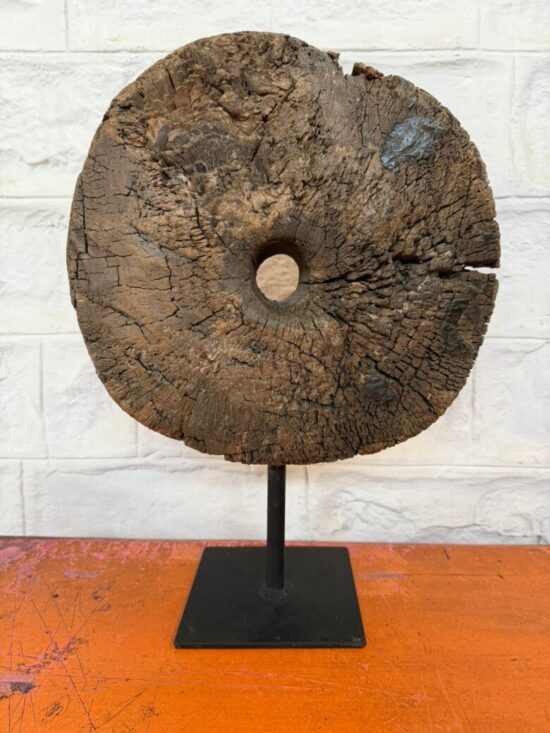 This vintage wooden wheel fragment is an authentic piece of rural history, now transformed into a striking sculptural décor object. Carved from aged, weathered timber, the wheel features deep natural cracks, rich texture, and a central spindle hole that reflects decades of use. Mounted on a minimalist black iron stand, it becomes a bold organic statement piece perfect for modern, rustic, industrial, or wabi-sabi interiors.