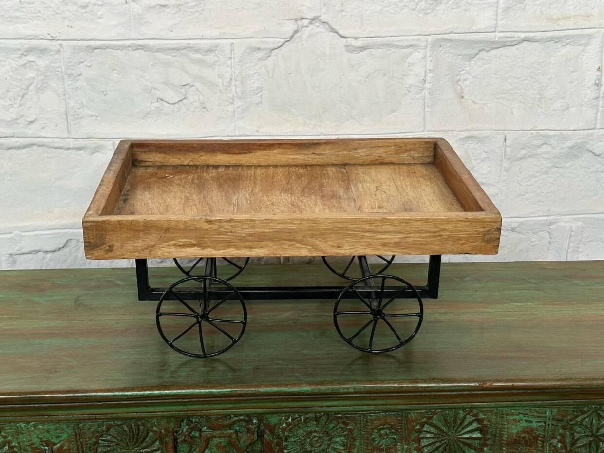 The tray’s surface retains the beautiful grain and texture of the wood, bringing a grounded and earthy tone to any tabletop. The iron wheels, though non-functional, evoke a vintage marketplace feel and give the piece its quirky, cart-like silhouette. Whether styled as a centerpiece on a dining table or used as a base for plants, candles, or collectibles, it adds dimension and personality to any space.