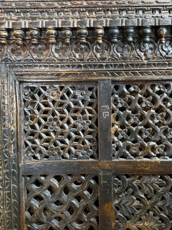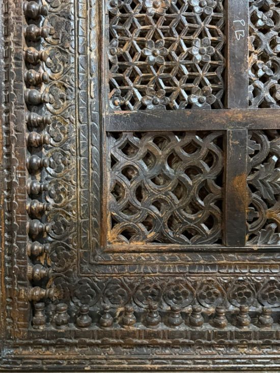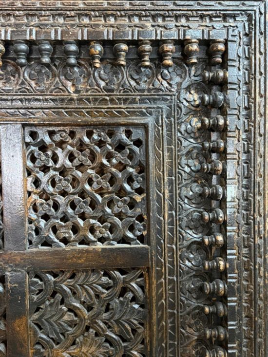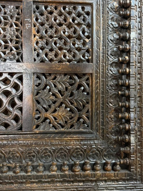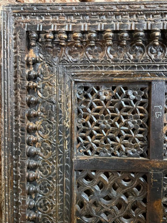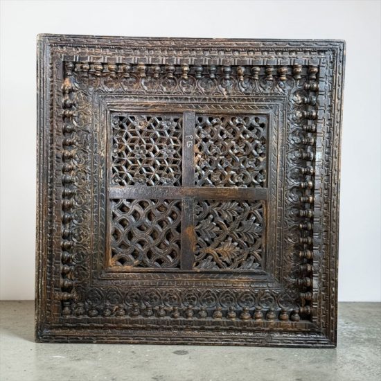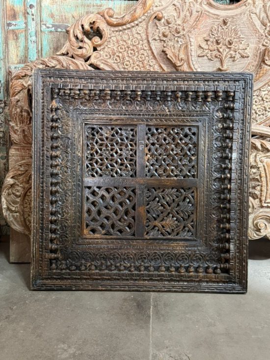 At its center lies a beautifully composed four-panel jali design, each section showcasing a different carved pattern—floral, geometric, and flowing motifs—demonstrating the artisan’s mastery and attention to detail. Surrounding this is a richly carved border with repetitive ornamental elements, creating depth, rhythm, and visual weight.