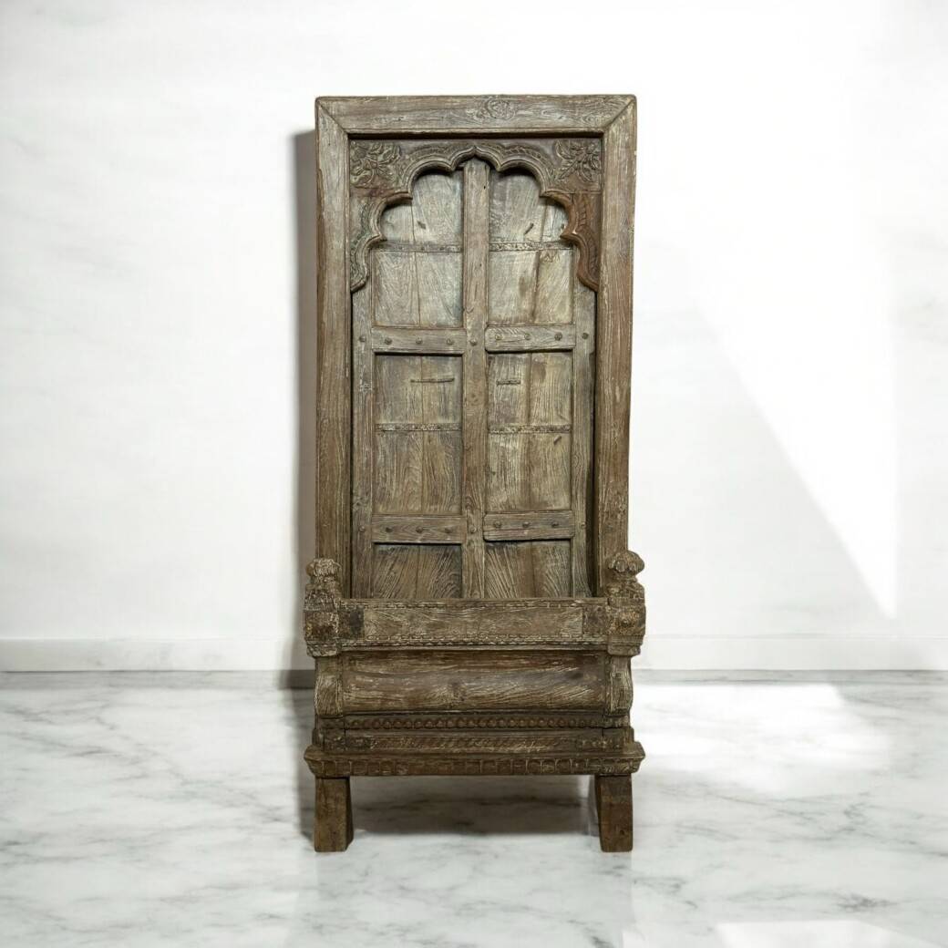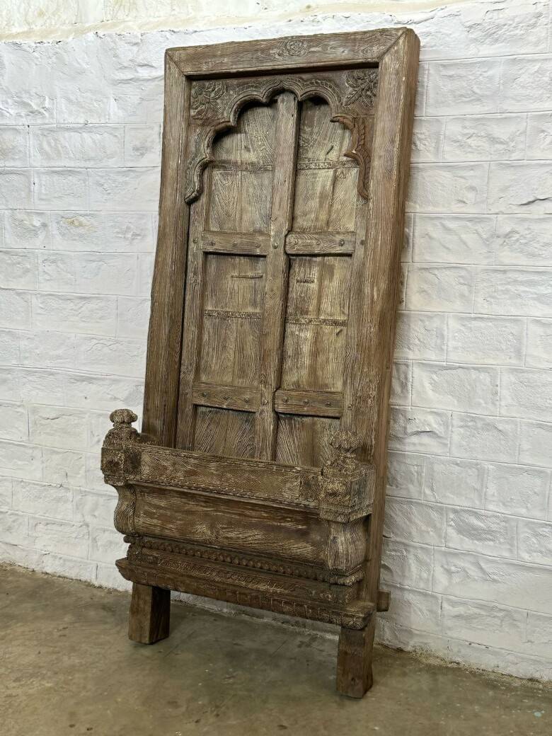 A stunning 90-year-old handcrafted wooden jharokha, featuring an intricately carved frame, arched top, and rustic double doors with iron brackets. Made from solid aged wood, it showcases a beautiful natural patina and timeless Indian craftsmanship.