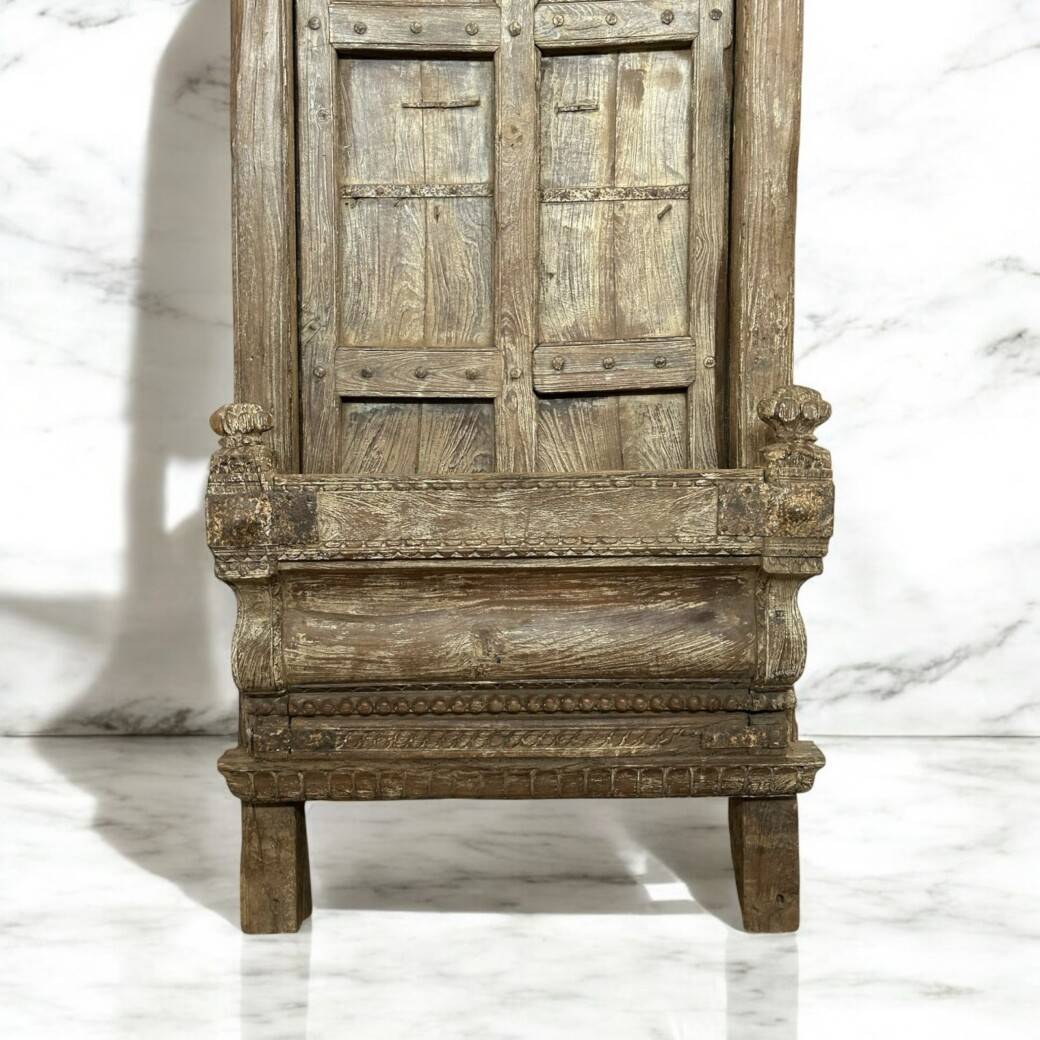 The arched top with floral and vine carvings showcases skilled Indian craftsmanship. The rustic wooden doors are adorned with iron brackets and hinges, adding both structural integrity and an old-world charm. The carved base and side brackets enhance its regal appearance, making it a striking statement piece.